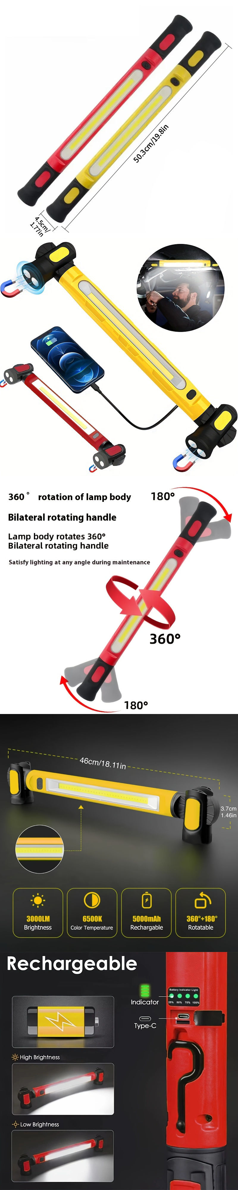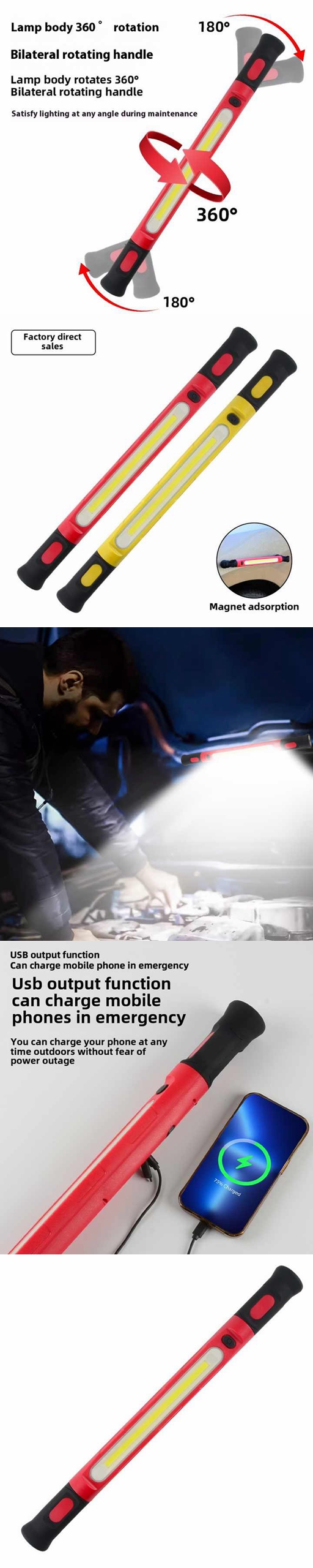 Two-color work light Cob large flood light large area lighting Double magnets with built-in adsorptionfunction Dual magnets withbuilt-in adsorption function Large area floodlight Type-c fast charge Power display Mobile phonecharging