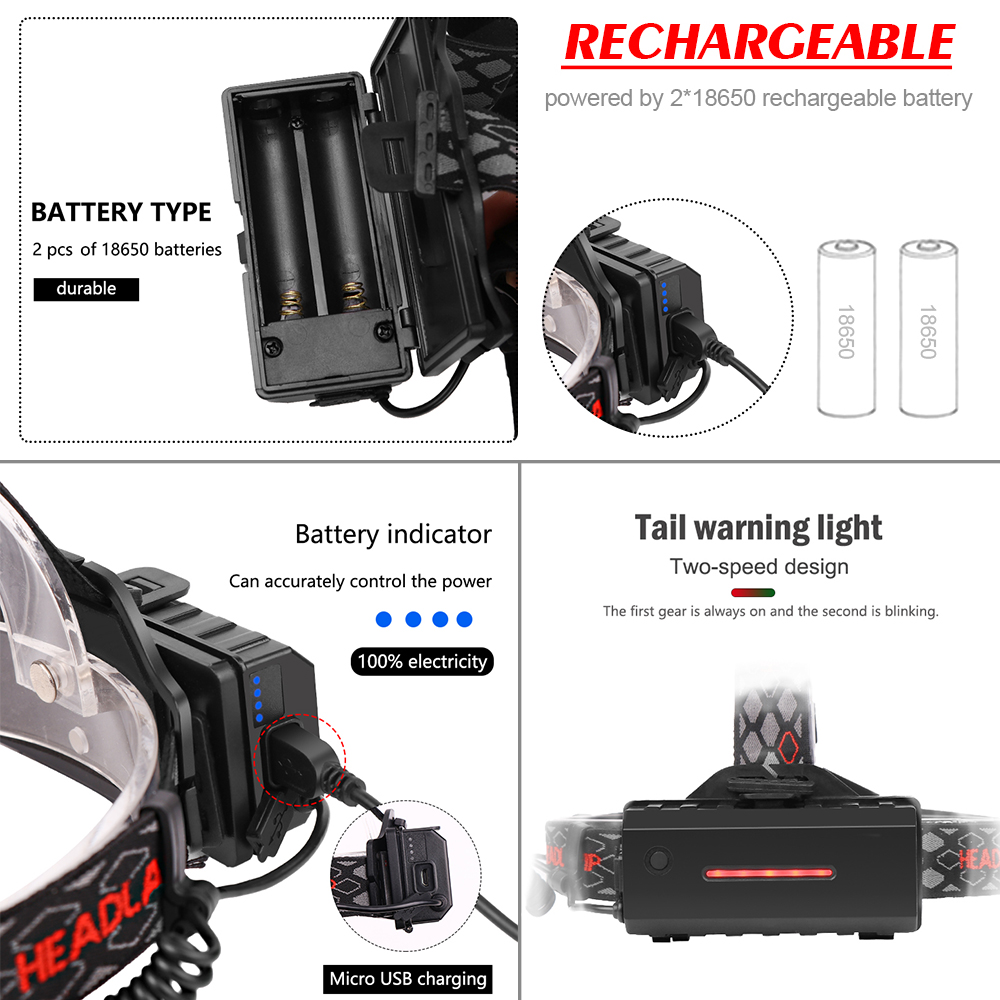 Switch modes: COB light source surface: strong light- weak light- flash; LED light source surface: T6 strong light- T6 weak light- XPE red light- XPE green light- XPE red and green light alternately flash